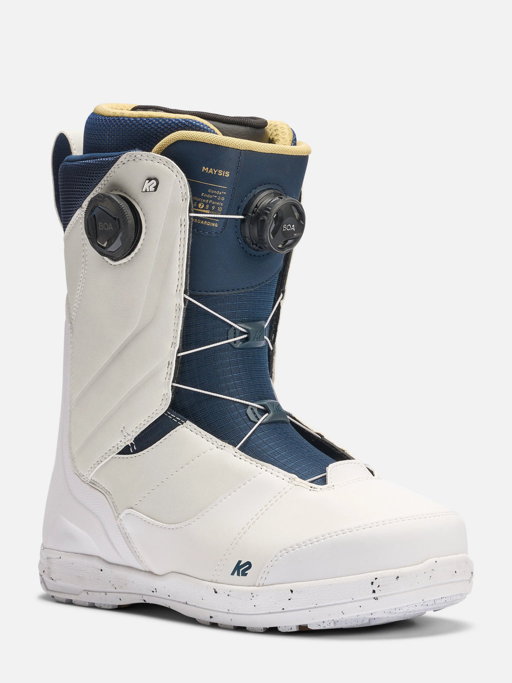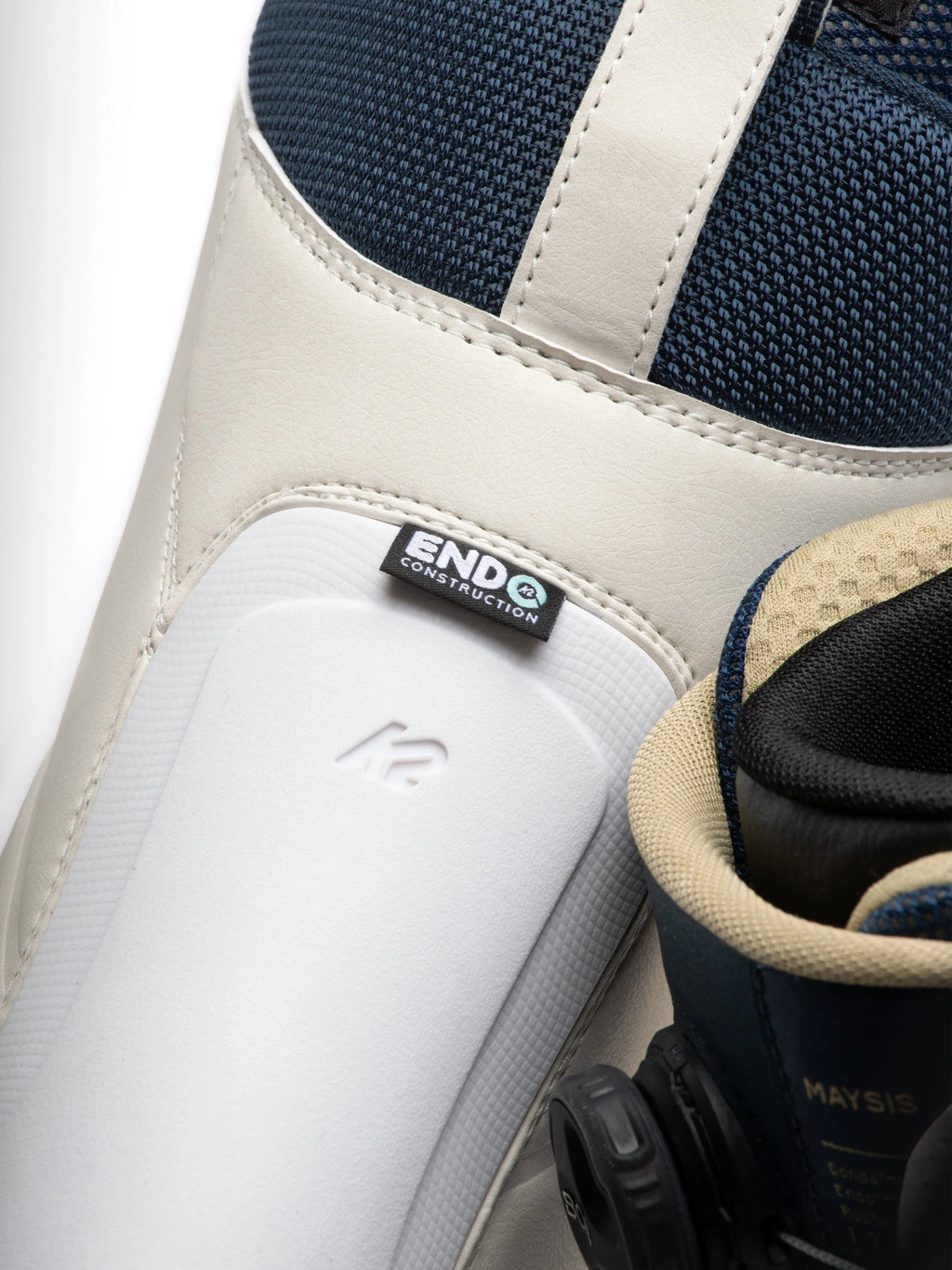 Lastly, to add durability and maintain the boot's flex over the boot's lifetime, we constructed the K2 Maysis using our NEW Endo™ 3.0 technology. Underfoot, we've used premium materials to improve damping and grip. The outsole is built using our proprietary This Grips!™ dual-rubber compound to provide excellent grip both on and off the snow. This is all set atop a dual-density midsole comprised of a lightweight EVA and our proprietary Harshmellow™, designed to dampen vibration on rough terrain and cushion big landings.
