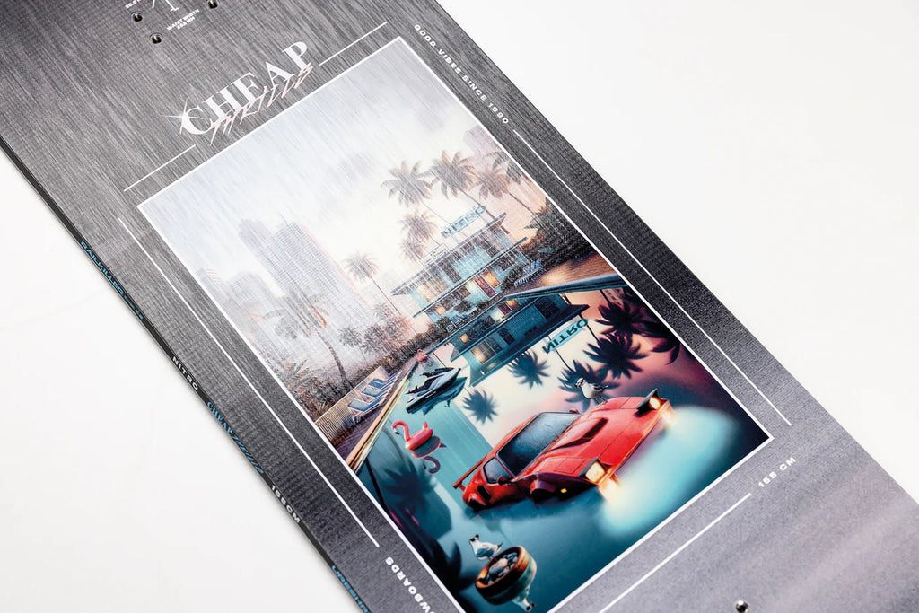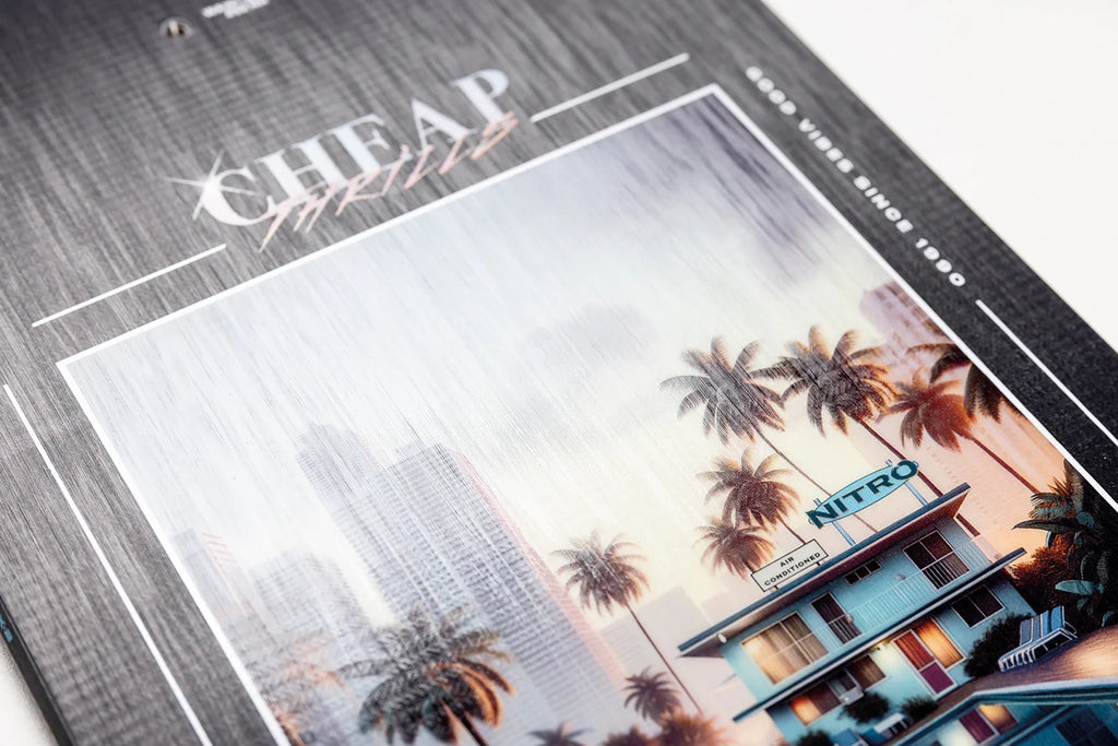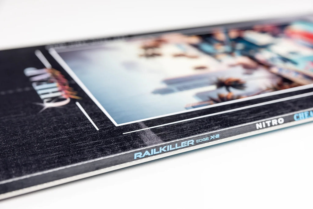 Designed and engineered with Flat-Out Rocker to be the most versatile medium-flexing park board on the mountain, the Cheap Thrills will provide that trippy freestyle ride any park rat is yearning for. Simultaneously, the Whiplash Core Profile delivers the stability and snap needed for sending it from feature to feature. The Railkiller Edges are twice as thick and twice as strong as a standard edge; in combination with Nitro´s Ureshred Sidewalls, you can go even harder in the park without worrying about your edges. Finally, you can forget about worrying about the performance of your base with the durability offered by Nitro´s Premium Extruded FH Base because it is fast and easy to maintain. Once strapped into the Cheap Thrills x Wigglesticks, you can let your imagination run wild from the park to the streets and hit everything in-between - let the trippy thrills begin on a progression-friendly park deck!